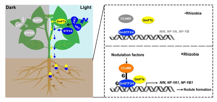 该研究首先设计了一系列精巧的实验,证明光合产物和光信号在调控共生结瘤过程中的作用不同,光合产物是促进根瘤菌侵染植物所必需的,但是来自地上的光信号是促进大豆地下根瘤发育的关键因子。作者鉴定了大豆中受光诱导的蛋白GmFTs和GmSTF3/4,从地上移动到地下,在根中相互依赖促进根瘤形成。并进一步通过质谱、分子生化和遗传分析证明共生信号通路关键组分CCaMK被根瘤菌激活后通过磷酸化GmSTF3/4,促进GmSTF3/4和GmFTs互作。GmFTs-GmSTF3/4能够直接激活根瘤起始关键基因NINNF-YA1NF-YB1的转录,从而调控根瘤形成。