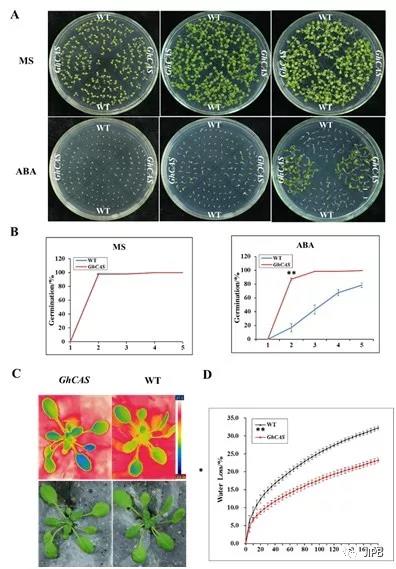 图 2. 棉花GhCAS基因超表达拟南芥在ABA处理条件下的生长表型及叶温和失水率