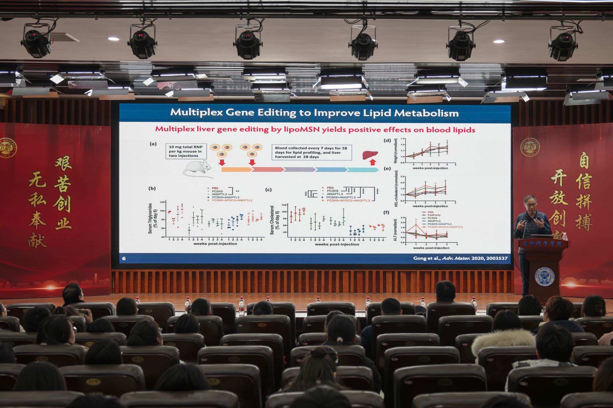 梁院士针对基因编辑元件的有效体内递送这一关键科学问题展开报告,详细介绍了其团队在体内基因编辑非病毒载体的开发方面所做的努力。重点介绍了团队开发的三代高分子递送载体口服递送基因编辑药物的脉络及生物医学应用,并且通过大规模筛选开发了高效脑部递送的脂质体制剂,并利用聚焦超声(FUS)的方式实现静脉给药基因药物有效穿越血脑屏障(BBB),从而达到脑部疾病基因编辑的目的。内容从点到线到面,给大家带来了一场非常精彩且全面的学术报告!提问环节,参会的老师、学生就报告内容以及自己在科研中遇到的困惑提出了问题,梁院士认真倾听并详细做解。