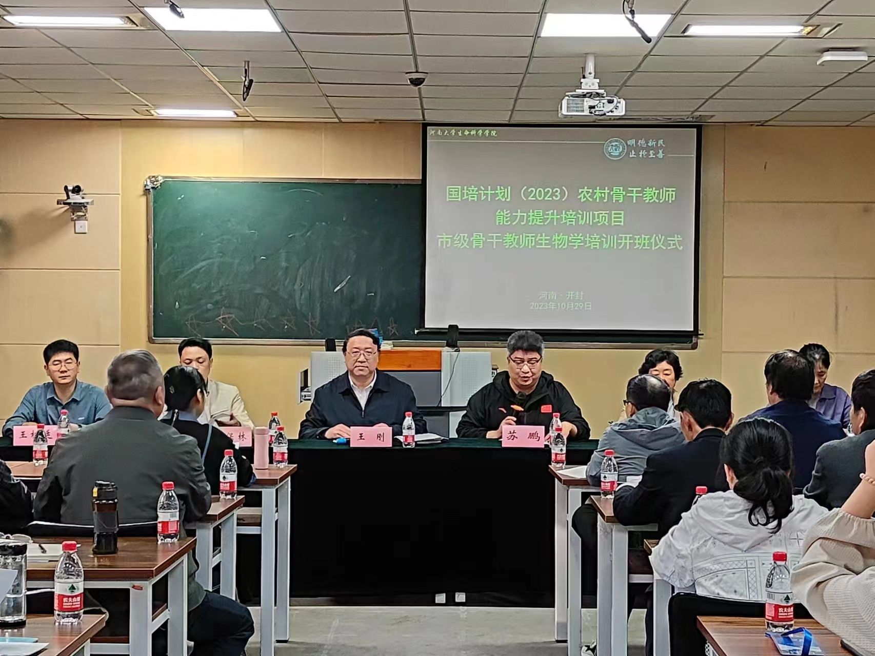 10月29日上午8点30分,242net官网登录入口“国培计划(2023)—农村骨干教师能力提升初中生物市级骨干教师”培训班在生科院B101教室正式开班。必赢242net官网必赢242net官网执行院长、党委副书记王刚,副院长苏鹏,院办公室主任王松廷,院成教办主任李黎,生物科学系副主任肖保林,项目课程负责人张彤,班主任孙文幸、李佳欣等项目组成员和50名来自全省各地的初中生物教师学员参加了开班仪式,仪式由学院副院长苏鹏主持。