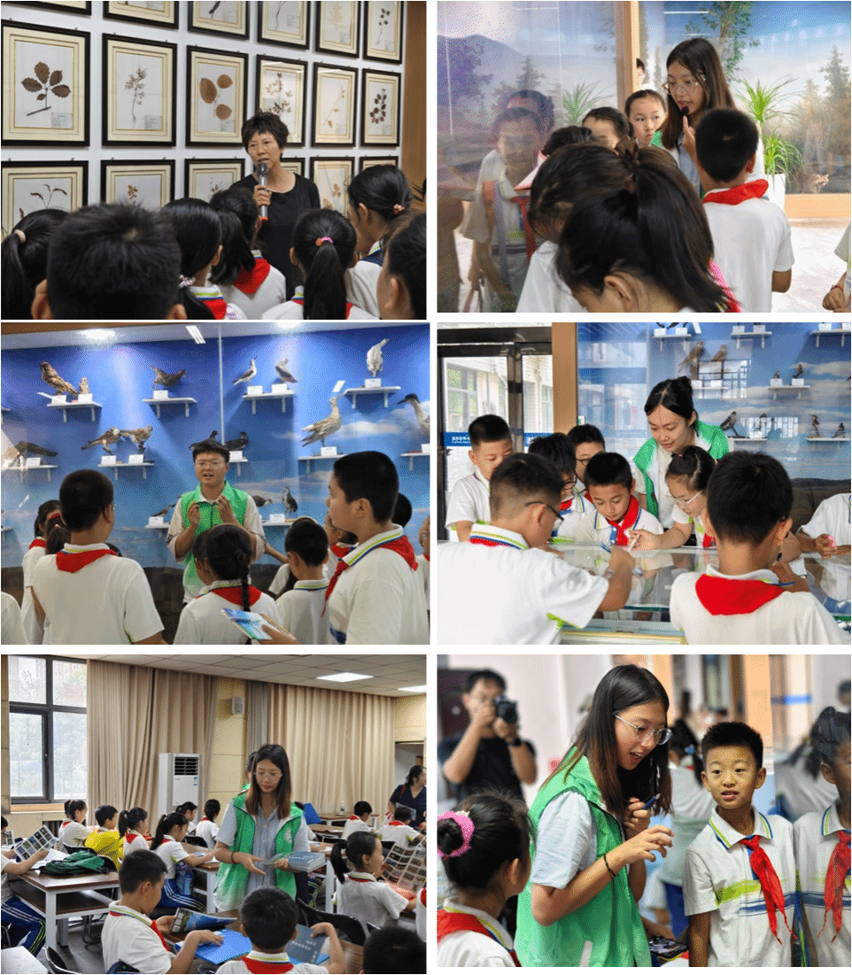 同学们满怀期待地走进标本馆,馆内栩栩如生的动物标本、五彩斑斓的植物标本,仿佛在诉说着生命的奥秘。志愿者们有序分工,以科普讲解、问答互动的形式带领孩子们沉浸式体验丰富多彩的生命之旅。志愿者们为孩子们讲解了雀形目中叫声动听的黄鹂、涉禽中灵动优雅的白鹭,引导孩子们如何区分夏日草丛中欢快活泼的蛐蛐和蝈蝈等,志愿者们还向同学们介绍了植物的采集、标本的制作、野外实习的经历等生动有趣的知识,孩子们兴趣高涨。在志愿者的引导下,孩子们仔细观察,认真聆听,不时发出惊叹声,对生命的多样性也有了更直观的认识。最后,志愿者为同学们分发了《河南省百种常见鸟类图册》。