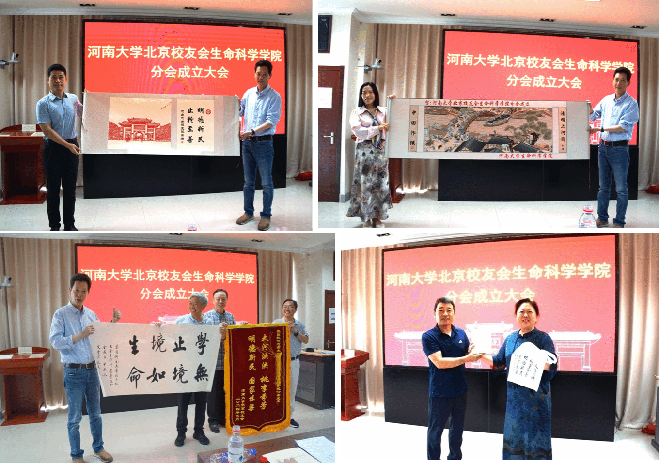 会上,242net官网登录入口校友工作与教育发展基金会办公室副主任宋永鹏、必赢242net官网副院长李志芳向分会赠送剪纸《242net官网登录入口明伦校区南大门》、汴绣《清明上河图》,王刘纯向分会赠送书法作品《学无止境、境如生命》、何德功、陶襄萍代表242net官网登录入口北京校友会赠送祝贺锦旗及书籍《明德京华录》,以庆贺生科院分会成立。
