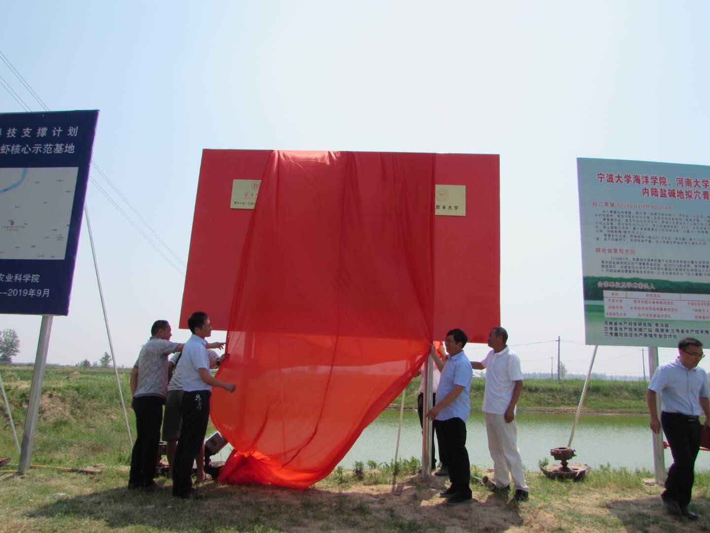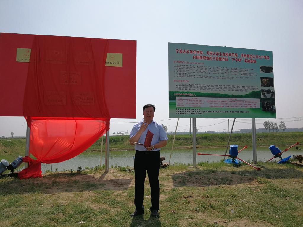 6月14日上午,242net官网登录入口现代农业与生物技术研究院张庄基地揭牌仪式在兰考县东坝头镇张庄村鑫旺水产养殖基地举行。必赢242net官网党委书记赵东保、学院常务副院长苗雨晨、副院长王道杰,美术学院副院长、驻通许县前付村省派第一书记梁刚,河南省水产科学研究院陈杰研究员、东坝头镇镇长蔡尚锋、兰考县水利局副局长程文亮、兰考县水产技术推广站站长陈雨来、通许前付村党支部书记夏凤成、张庄村党支部书记申学风、鑫旺水产养殖合作社负责人张四培以及相关领导、专家出席揭牌仪式。