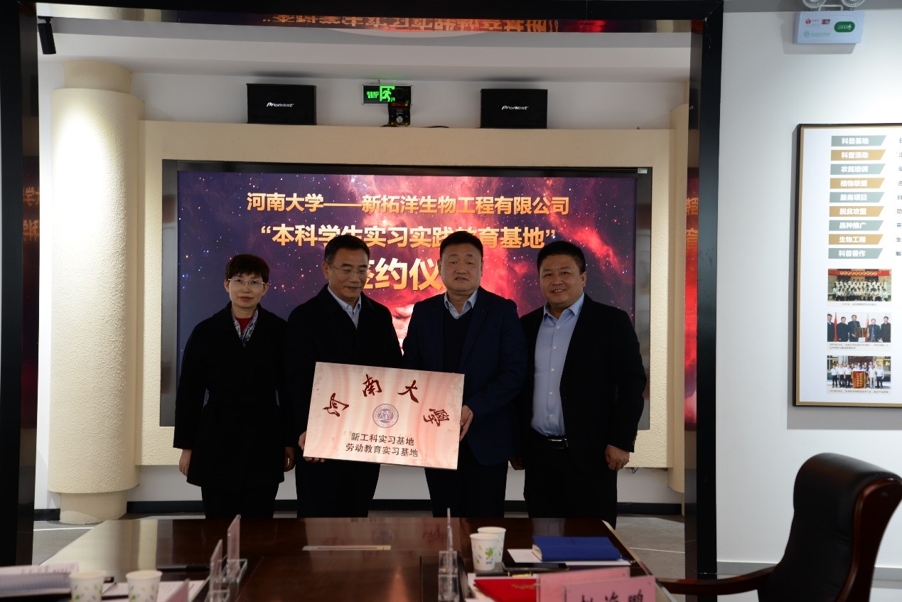 根据前期242net官网登录入口与新拓洋生物工程有限公司已达成的意向和签署的协议,秦天苍、陈黎、张立新、赵海鹏共同为生物工程专业新工科实习基地揭牌。