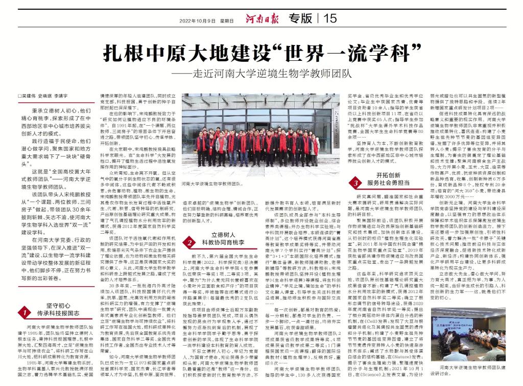 30多年来,一批批海内外英才陆续加入该团队,科技报国情怀代代传承,抗旱、固氮、光高效利用方向的凝练和科研实力的增强,有力支撑了“逆境生物学”研究,团队中涌现出一批黄大年式高素质专业化创新型教师。他们立足“逆境生物学与可持续农业”,将科研工作写在祖国大地,把科研成果转化为教育资源,先后获全国教育系统先进集体、国家自然科学奖二等奖、全国优秀科技工作者、全国杰出专业技术人才等荣誉。