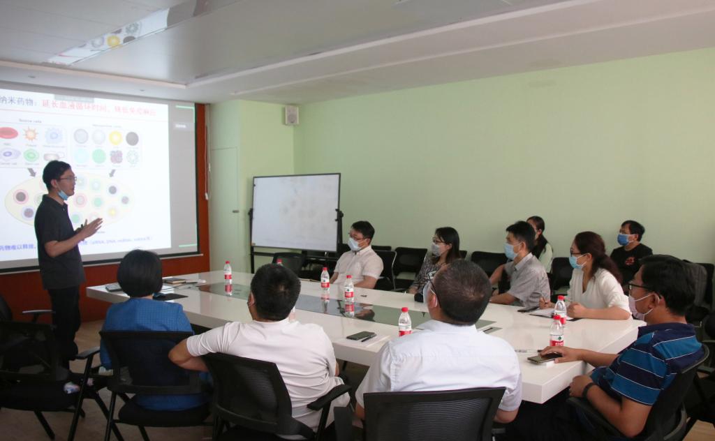 在研讨阶段,参会专家和学者就自己的研究领域与郑蒙进行深入探讨。郑蒙针对数学与统计学院的邹广安博士提出的“siRNA递送过程中是否受到血液流变的影响”、基础医学院黄永伟博士提出的“如何实现载体与siRNA作用力定量表征及肺癌模型建立”、药学院张旭博士提出的“药物PEG修饰效应与片段大小的关系”、纳米材料工程研究中心赵彦保博士提出的“如何构建具有药物装载普适性的聚合物囊泡”、基础医学院刘中华博士提出的“siRNA化学修饰和定量”和生科院王彦明博士提出的“siRNA成药的常用和现有载体种类”、曹更生博士提出的“如何实现药物靶向递送”、张表博士提出的“聚乙二醇药物包裹效率”等十多个问题进行了一一作答。针对数学与统计学院的杨晓慧博士提出的如何寻找切入点实现生命科学和数学学科的跨学科交叉融通创新问题,王彦明、郑蒙、黄永伟等学者畅所欲言,分享各自的见解和体会,学术氛围浓厚。在现场专家热烈讨论的同时,线上参会的专家学者也纷纷提问。主题报告引发的充分而热烈讨论,成为本期午茶会的最大亮点。
