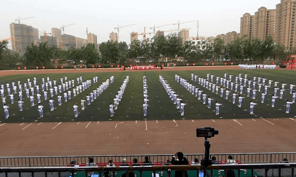 随着舒缓悠扬的古筝乐曲响起,同学们迅速抬手抱拳行礼,动作干脆利落。在排头教练的带领下,同学们缓缓起手,云手、提膝、出掌、野马分鬃、金鸡独立、白鹤亮翅……同学们跟着乐曲节奏打出孙氏太极拳中的一招一式,行云流水,浑然一体,将太极拳的刚柔并济、阴阳相合表现的淋漓尽致。整齐划一的动作赢得了在场师生的阵阵掌声。
